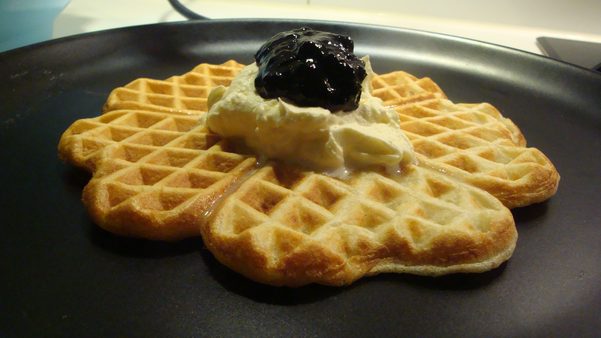 Jag fullkomligt älskar våfflor, av alla slag. Dessa våfflorna är ju ur en synvinkel nästan nyttiga?! Det beror i och för sig på vilka tillbehör som önskas. Här har jag klassiskt med grädde och blåbärssylt. Receptet räcker till cirka 20 mellantjocka våfflor. Smeten går alldeles utmärkt att spara i kylen ett par dagar.