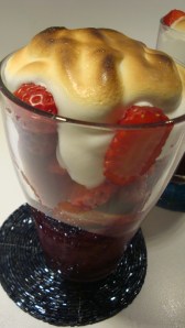 Vispa äggvitorna till hårt skum, och vispa ner sockret. Lägg sedan blåbärsglass i botten på varje glas, och de skivade jordgubbarna på glassen. Toppa med den vispade äggvitan. Sätt in glasen i övre delen av ugnen på grillvärme i ½-1 minut, tills de fått färg. Serveras direkt från ugnen!