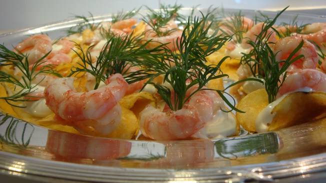 Lägg chipsen på en stor bricka. Klicka på lite gräddfil och dekorera med dill och räkor. Skål!