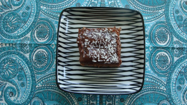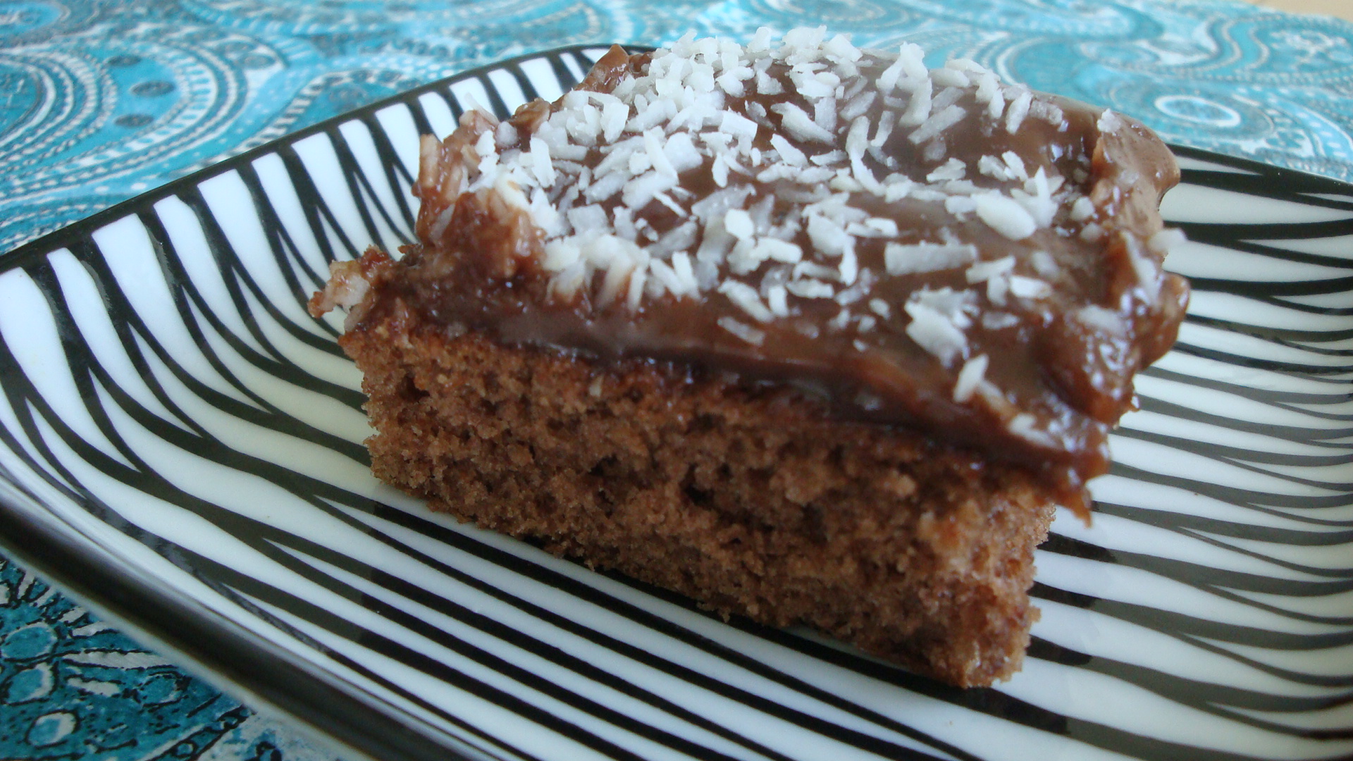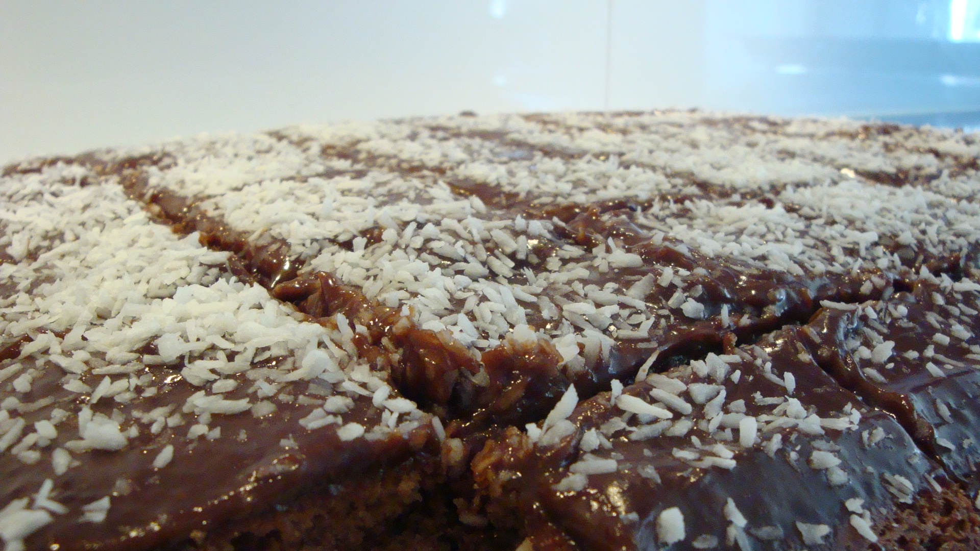 Smält smöret. Tillsätt de övriga ingredienserna och koka cirka 5 minuter eller tills den tjocknat. Rör hela tiden. Bred sedan krämen över kakan och garnera med kokos. Skär i rutor, cirka 30 stycken.