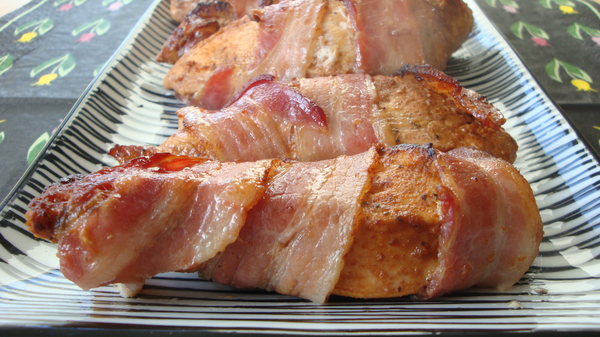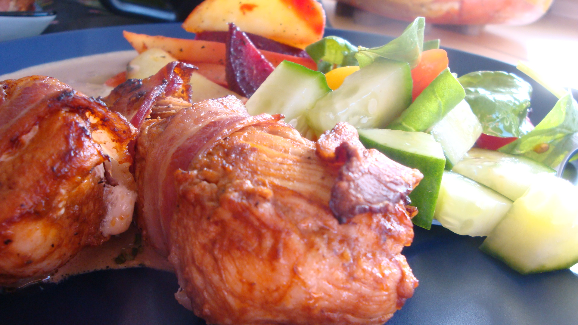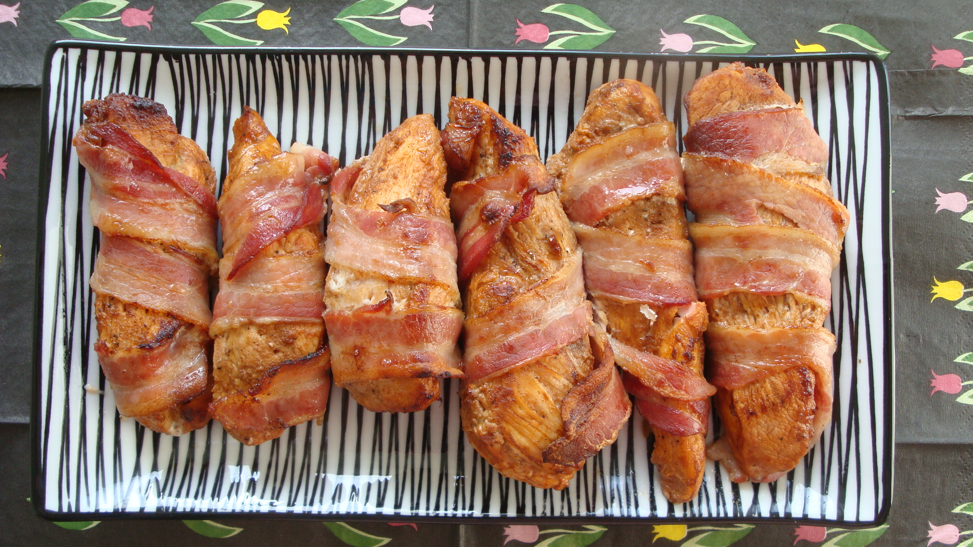 Stek kycklingen snabbt på hög värme så de får lite färg (Tips! Spara påsen med resten av marinaden till ev sås.). Linda dem sedan med 1 baconskiva var och lägg i en ungnssäker form. Ställ in i ugnen cirka 30 minuter i 200 grader. Sätt på grillvärmen de sista 5 minuterna så baconet blir lite knaprigt.