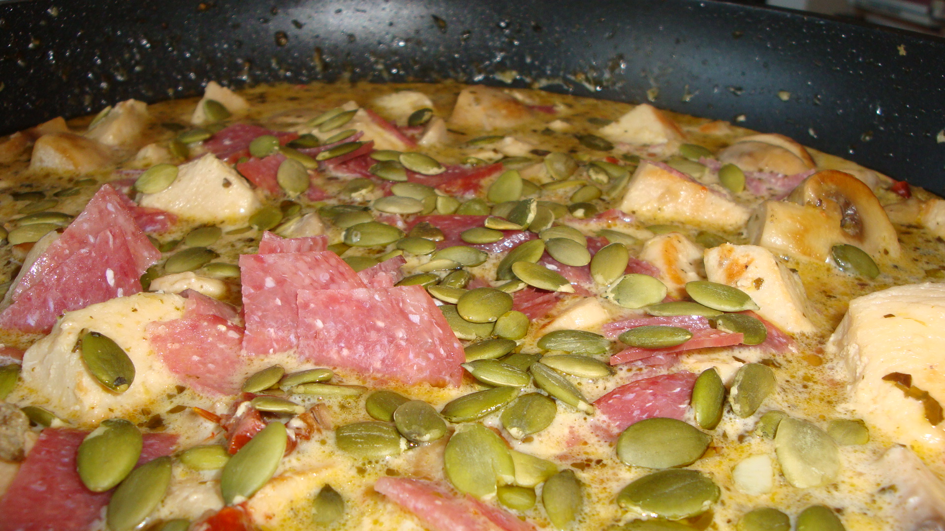 Skär de soltorkade tomaterna och champinjonerna i mindra bitar. Stek tillsammans med vitlöken och häll upp på tallrik så länge. Skär kycklingen i mindre bitar och stek i smör. Salta och peppra. Tillsätt de vitlöksstekta tomaterna och champinjonerna. Lägg i pesto, kycklingfond och vatten och koka i några minuter. Tillsätt matlagningsgrädden och låt det småputtra en kvart. Tillsätt hackad salami och pumpafrön precis innan servering. Koka ris eller potatis som tillbehör. Smaklig måltid!