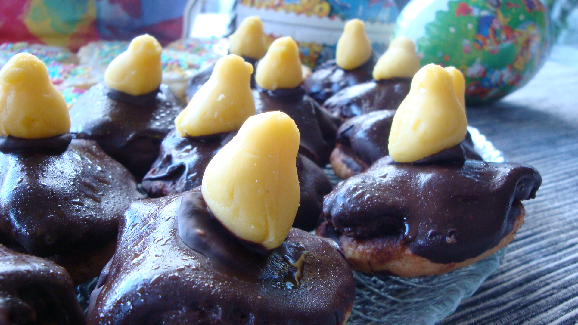Smält blockchoklad och olja i vattenbad. Låt svalna något och doppa kakorna snabbt. Här dekorerade med påskkyckling i marzipan. Förvaras kallt.