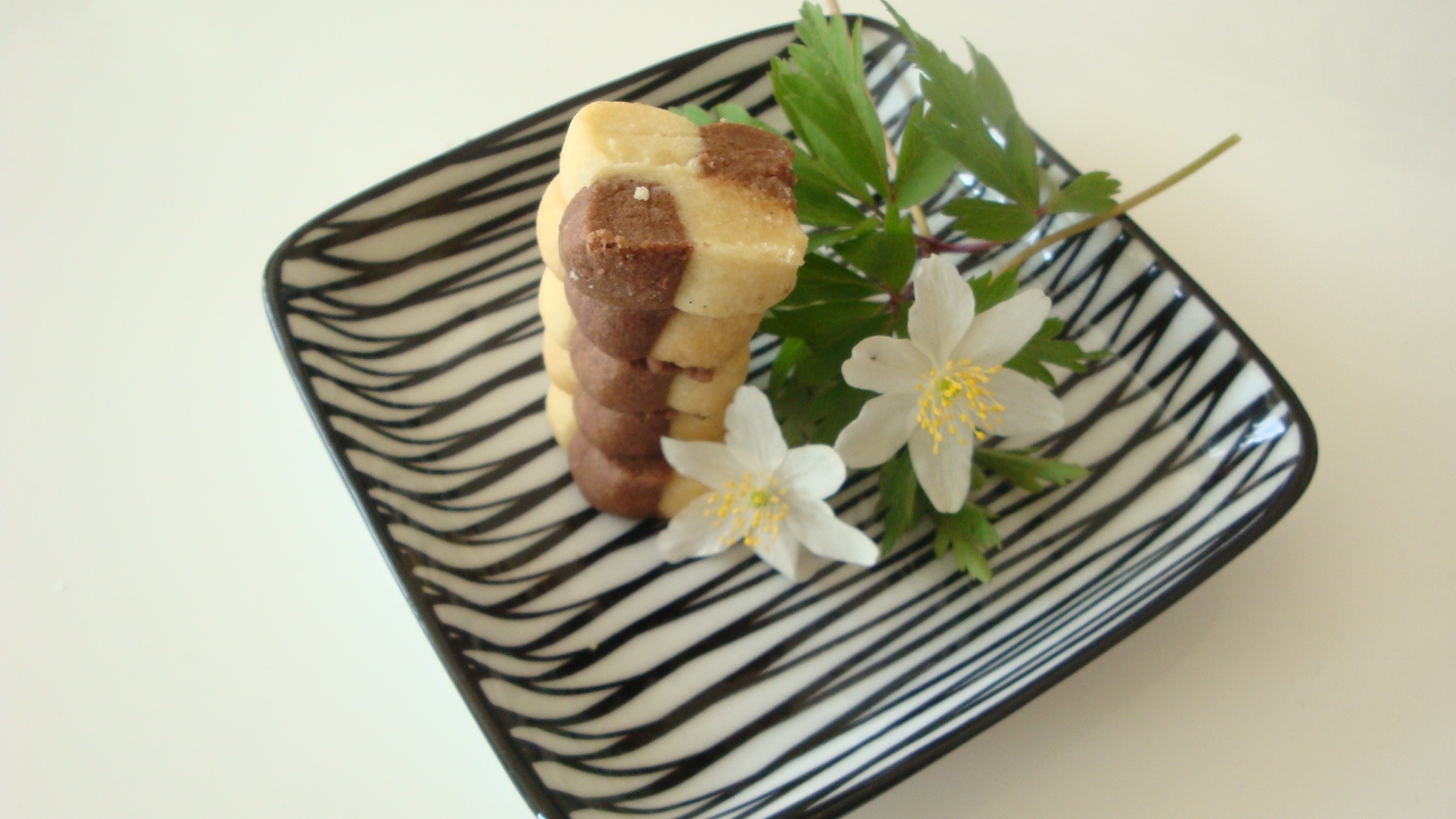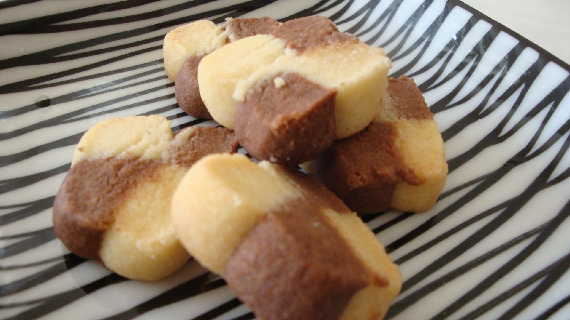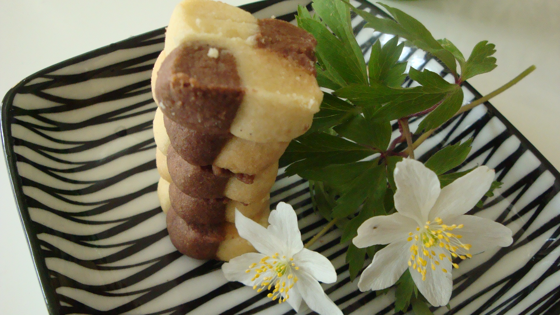 Blanda strösocker, vetemjöl potatismöl, bakpulver och smör i en bunke. Alternativt använd en matberedare. När du har fått en slät deg delar du den i två delar. Ta sedan och knåda in kakao i den ena, och vaniljsocker i den andra. Rulla vardera deg till två långa korvar, cirka 50 cm långa. Lägg en brun och en vit ”korv” brevid varandra. Lägg sedan den andra bruna ”korven” över den vita, och den vita ”korven” över den bruna. Nu har du alltså alla fyra ”korvar” på varandra så varannan är brun, varannan vit. Lägg i kylen i cirka 30 minuter.