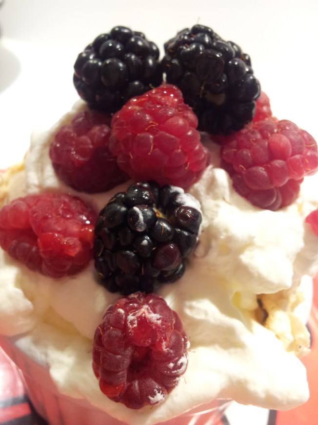 Nu kommer den Anette! Den glömda marängen med sitt vita fluff som smälter i munnen. Hemligheten är att den skall stå över natten i ugnen. Enligt originalreceptet skall den göras i stor ugnsfast form och sedan grädde och färska bär på. Jag gjorde istället i små potionsformar och halverade receptet. Det blev perfekt för 4 personer! Detta får bli mitt bidrag i Månadens Sötsak.