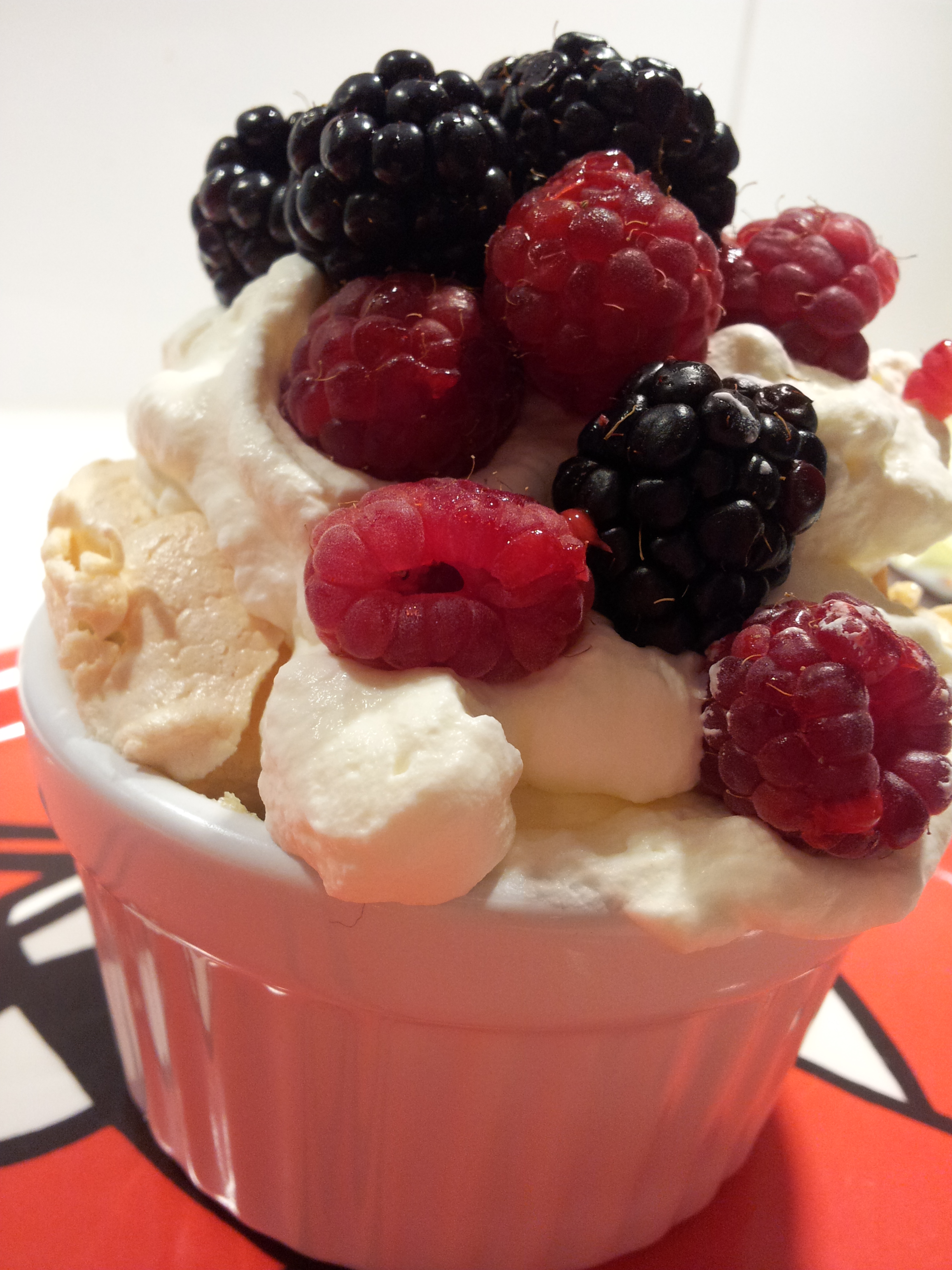 Vispa äggvitorna hårt. Du skall kunna vända skålen upp-och-ned. Vispa i sockret. Klicka i smeten i formarna. Grädda i 150 grader, 20 minuter (30 minuter till hel form). Och nu kommer hemligheten: stäng bara av ugnen och låt formarna stå kvar över natten I UGNEN. Servera med vispad grädde och färska bär. Njut!