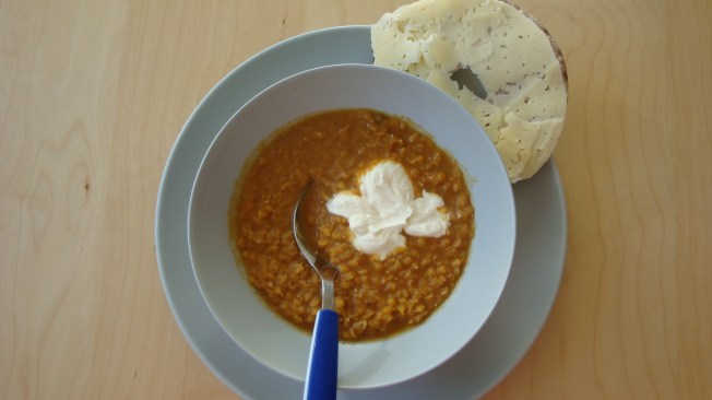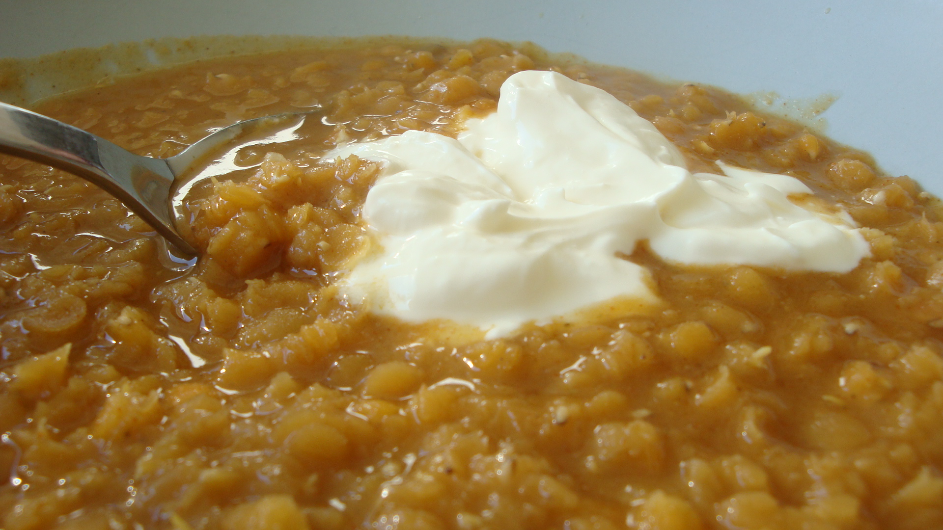 Hacka vitlöken och stek mjuk i olja. Tillsätt linser, vatten, buljong och kryddor. Droppa i citronsaften. Låt koka utan lock i cirka 15 minuter. Servera med en klick créme fraiche.