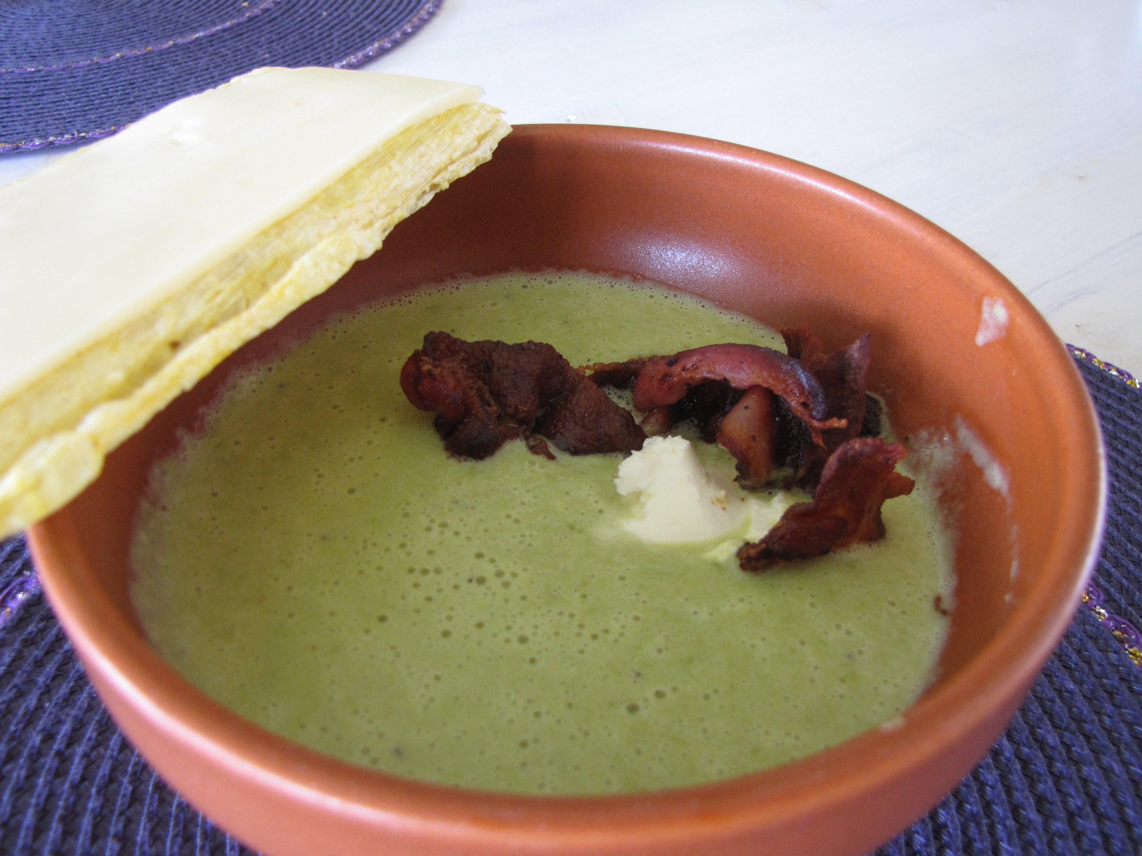 En lätt, snabb och krämig soppa i härlig grön färg. Tillbehören kan man variera, här valde jag knaperstekt bacon med cream cheese. Men varför inte lax och räkor?