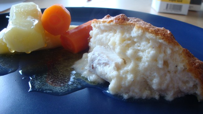 Tillsätt äggulorna i mjölkblandningen, och rör ner fisken. Vänd i vitorna och häll upp i ugnsfast form. Grädda 35 minuter långt ner i ugnen, 200 grader. Servera till smält smör och kokt potatis.