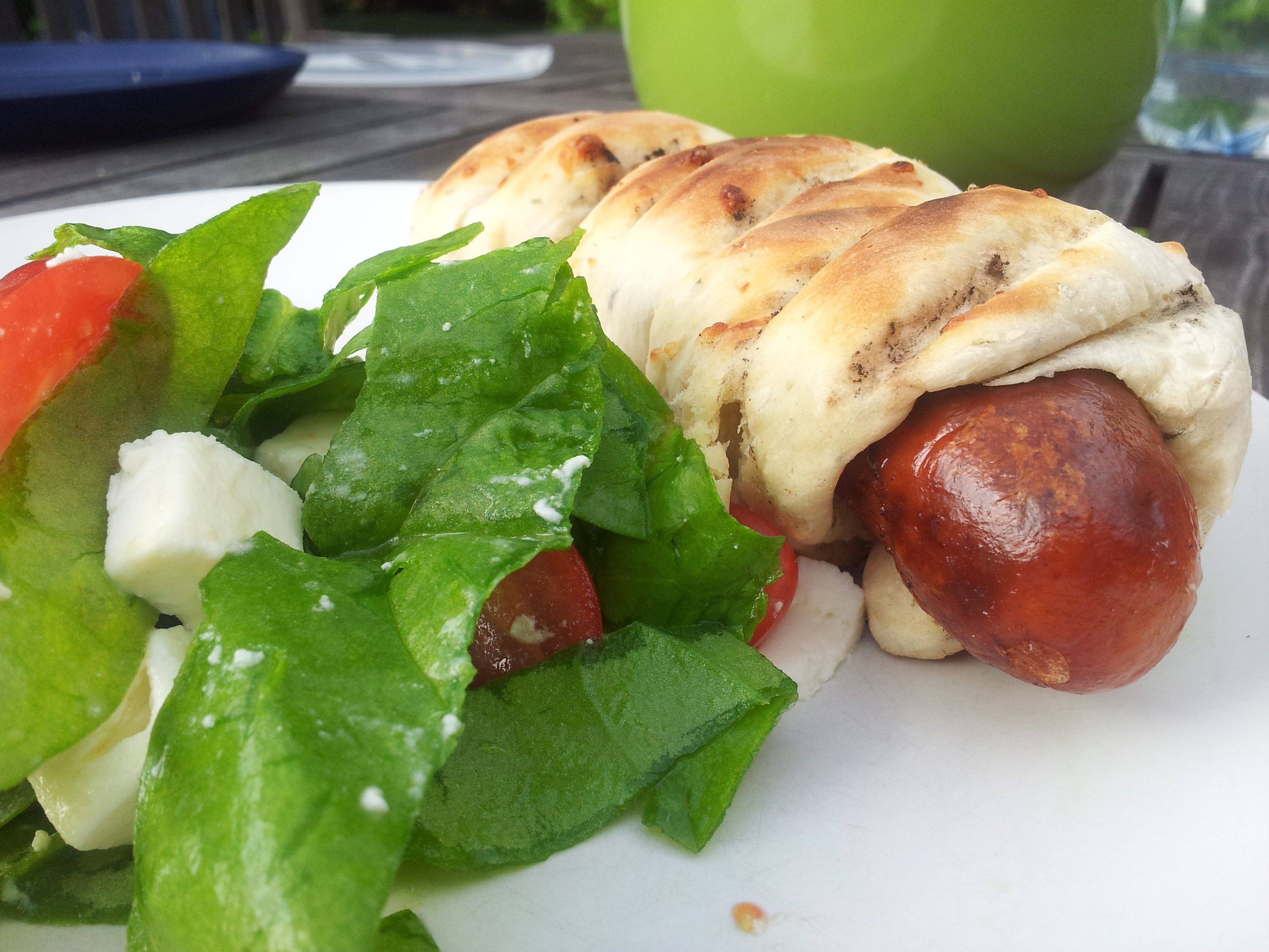 När korvarna är grillade och tillräckligt svala för att du skall kunna ta på dem delar du degen i 6 klumpar. Rulla ut var och en till långa ormar och rulla runt korven. Lägg på grillen och glöm inte vända dem. Färdiga att servera, lämpligen till en sallad med pesto. God sommar!