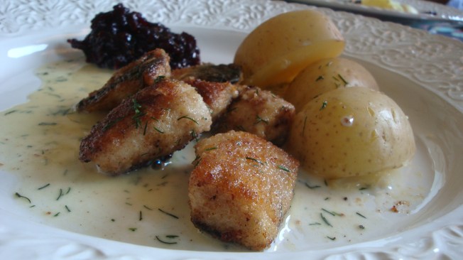 När all fisk är stekt häller du i mjölk och 25 gram smör i pannan. Låt koka ihop. Tillsätt klippt dill. Klar att servera till den stekta makrillen med kokt potatis och hemmagjord lingonsylt.