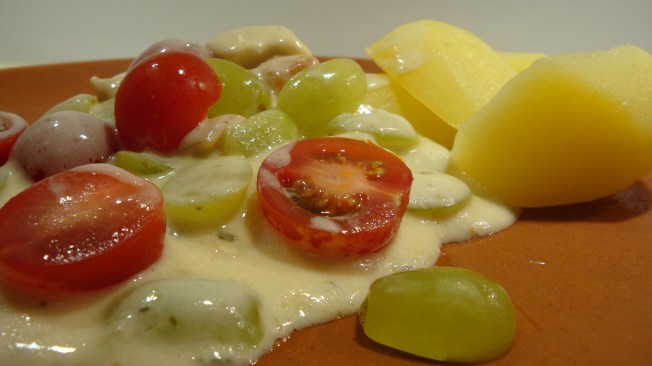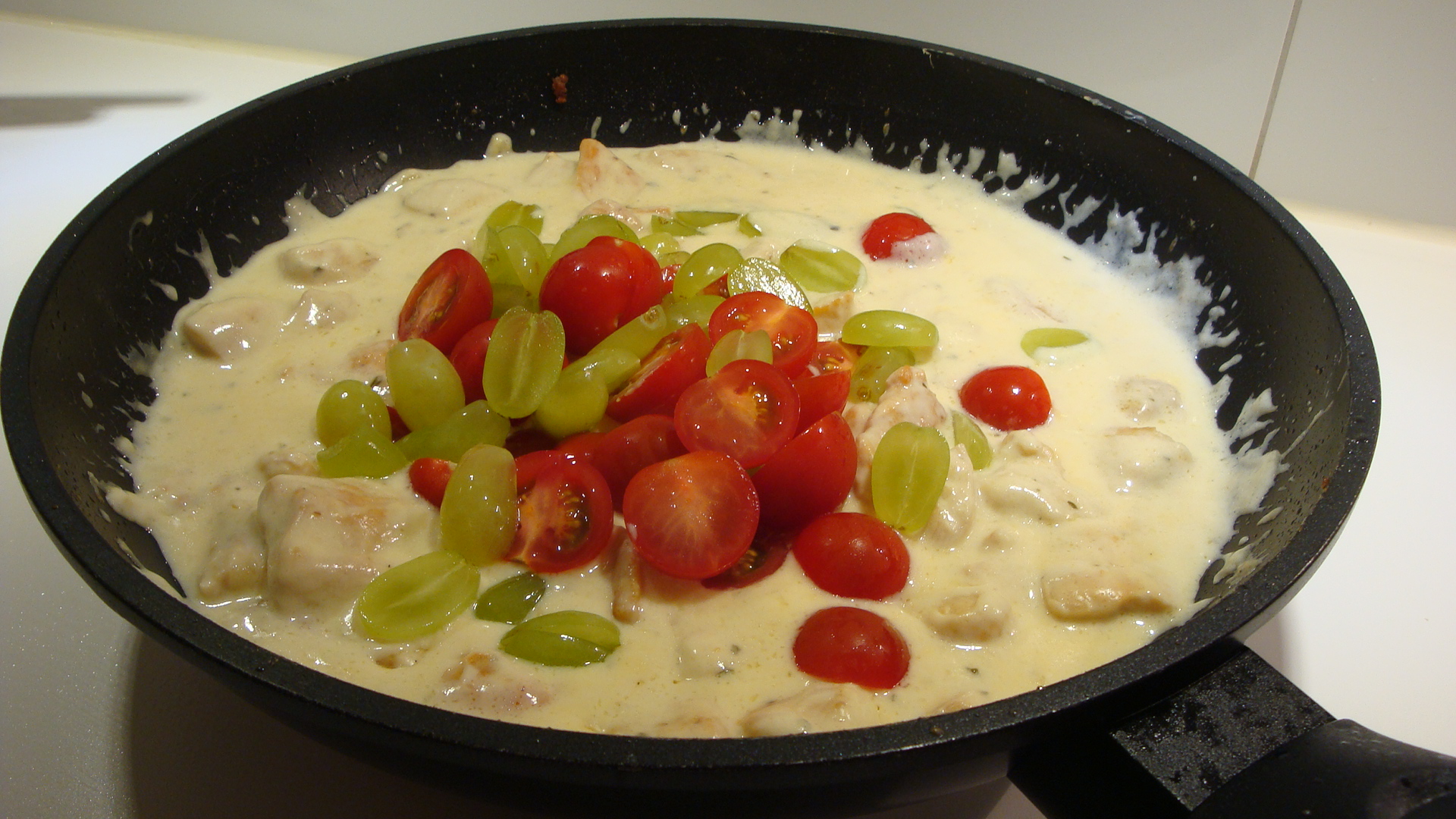 Tillsätt tomaterna och vindruvorna precis innan servering. Passar bra både till ris, potatis och pasta.