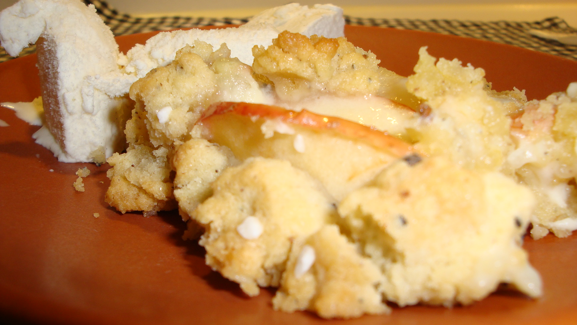 Skär äpplena i tunna skivor. Lägg över citronfyllningen och fördela den resterande halvan av degen över. Strö över lite pärlsocker. Grädda i cirka 30 minuter mitt i ugnen tills den fått lite färg och fyllningen stelnat.