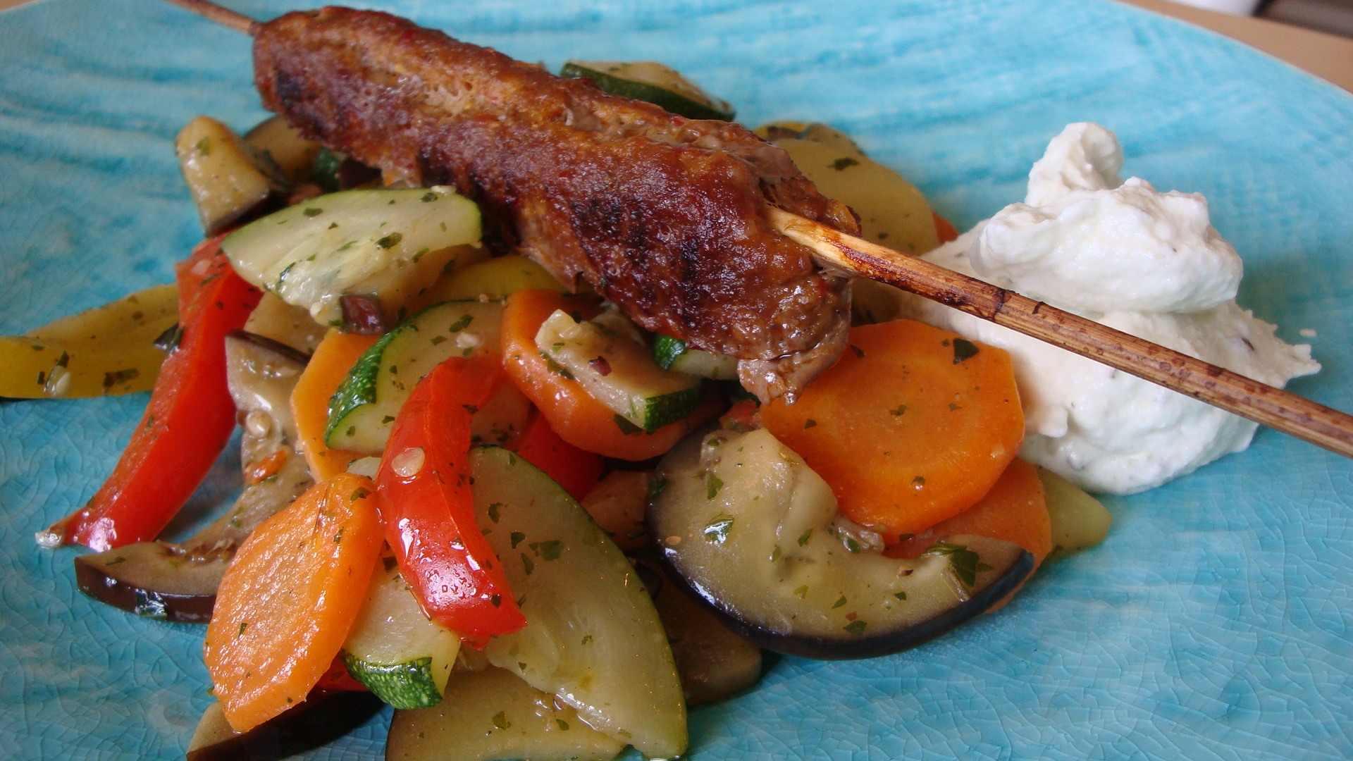 Under tiden färsspetten är i ugnen skalar och hackar du potatis och morötter. Bryn i en stekpanna med smör. Därefter skär du aubergin, squash och paprikor i små bitar. Lägg i pannan tillsammans med potatis och morötter. Tillsätt olja, flingsalt och peppar och låt ligga i pannan några minuter.