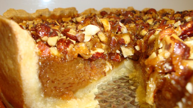 Nu är det dags för fyllningen. Vispa ägg, sirap, farinsocker, smält smör, whisky, vaniljsocker och salt. Häll fyllningen i det förgräddade pajskalet. Grädda cirka 45 minuter i nedre delen av ugnen, 175 grader. Lägg folie över mot slutet så den inte bränns.