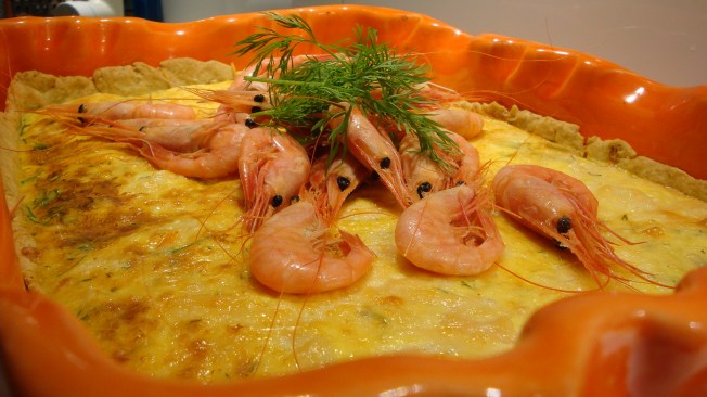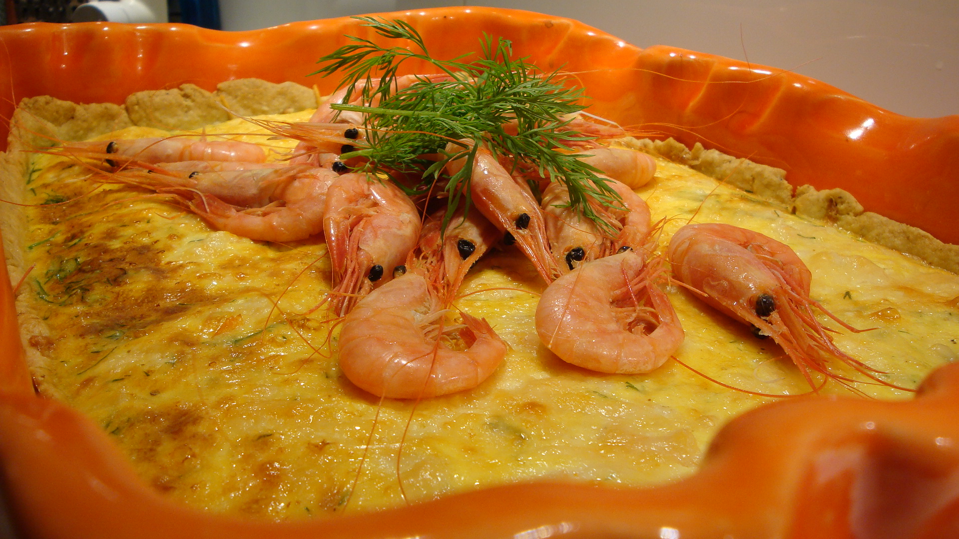 Gör pajdegen enligt recept. Förgrädda. Lägg i de avrunna färdigskalade räkorna i pajskalet. Blanda ägg, matlagningsgrädde, vitt vin, skaldjursfond, grönsaksfond, dill och riven ost. Salta och peppra. Häll äggsmeten över räkorna och ställ in i ugnen cirka 40 minuter, 200 grader. Lägg de oskalade färska räkorna på pajen direkt efter ugnen. Servera genast, gärna med citronsås och sallad.