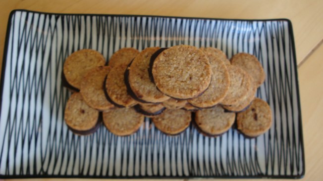 Sätt ugnen på 200 grader. Skär rullarna till centimetertjocka skicor. Lägg på bakplåtspappersklädda plåtar och grädde mitt i ugnen 8-10 minuter. Lått kallna på plåten.