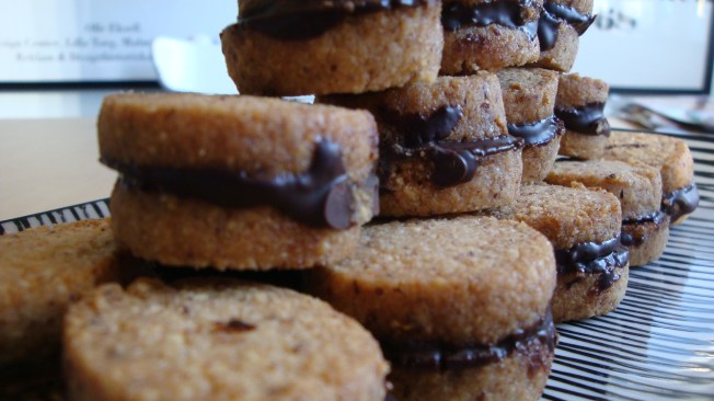 Smält chokladen i vattenbad. Lägg samman kakorna två och två med smält choklad emellan.