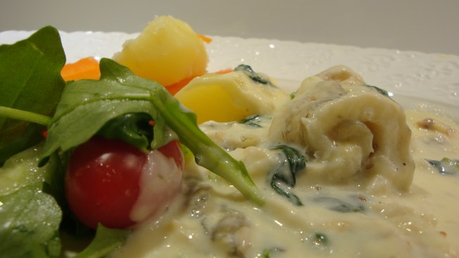 Skölj och torka fisken. Salta, peppra och rulla dem. Lägg ovanpå spenaten och häll ostsåsen över. Grädda i 200 grader, 35 minuter. Smaklig spis!