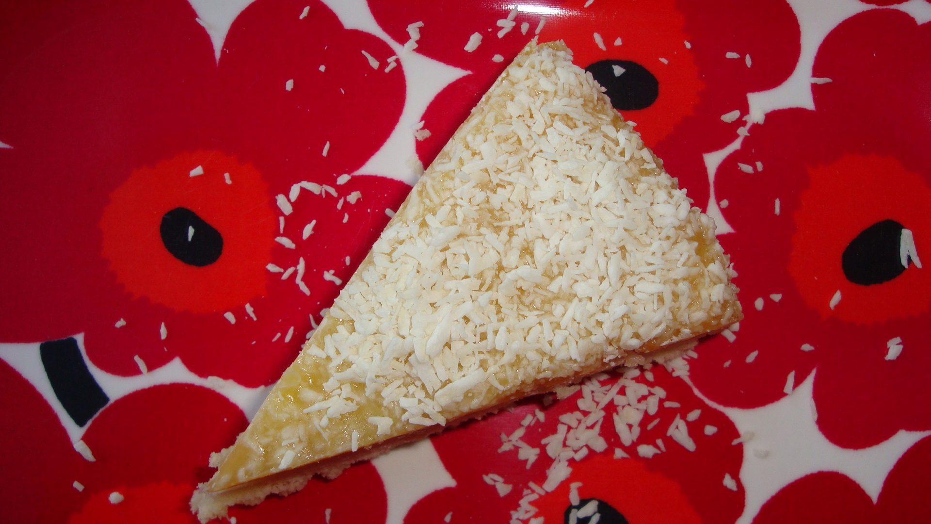 Bred vaniljkrämen på den avsvalnade kakan och strö på rikligt med kokosflingor.