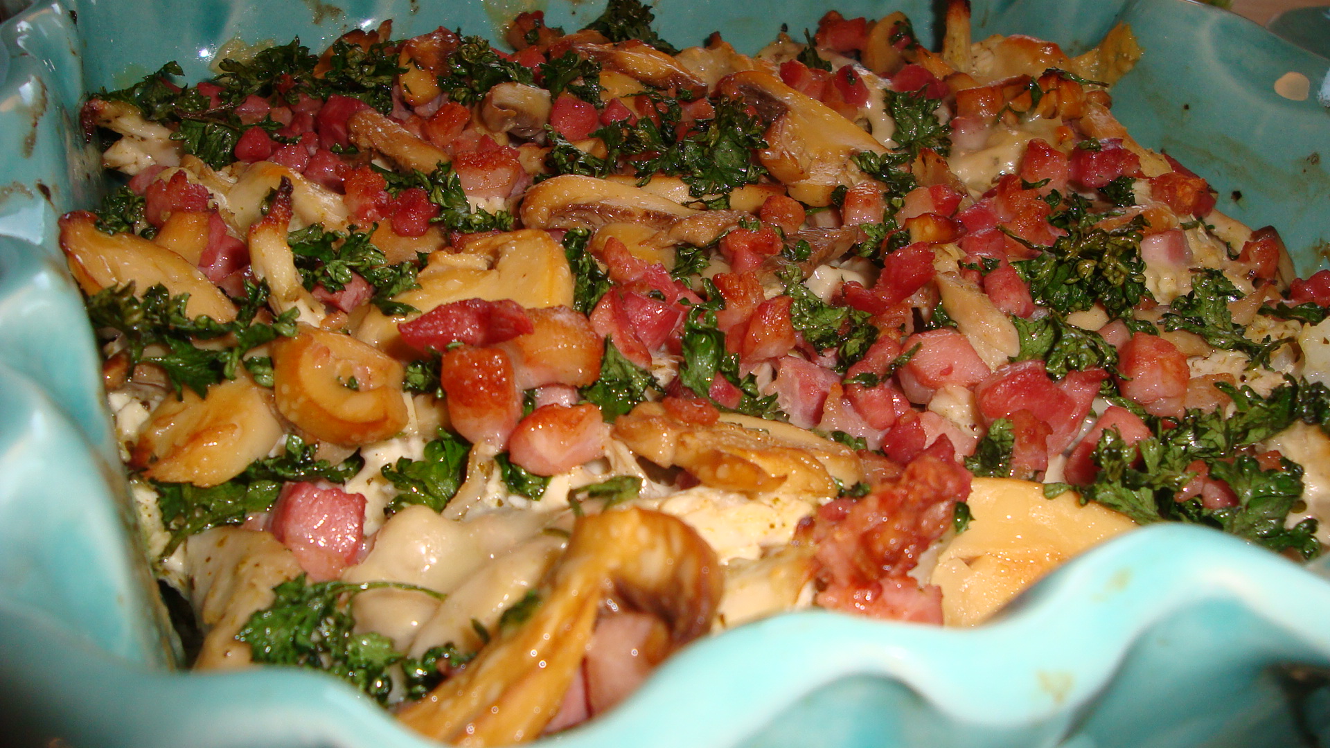 Stek bacontärningarna med champinjoner i några minuter. Klipp över persiljan och rör runt. Häll blandningen över resterande i ugnsformen och gratinera i cirka 20 minuter, 225 grader. Servera till härlig sallad!