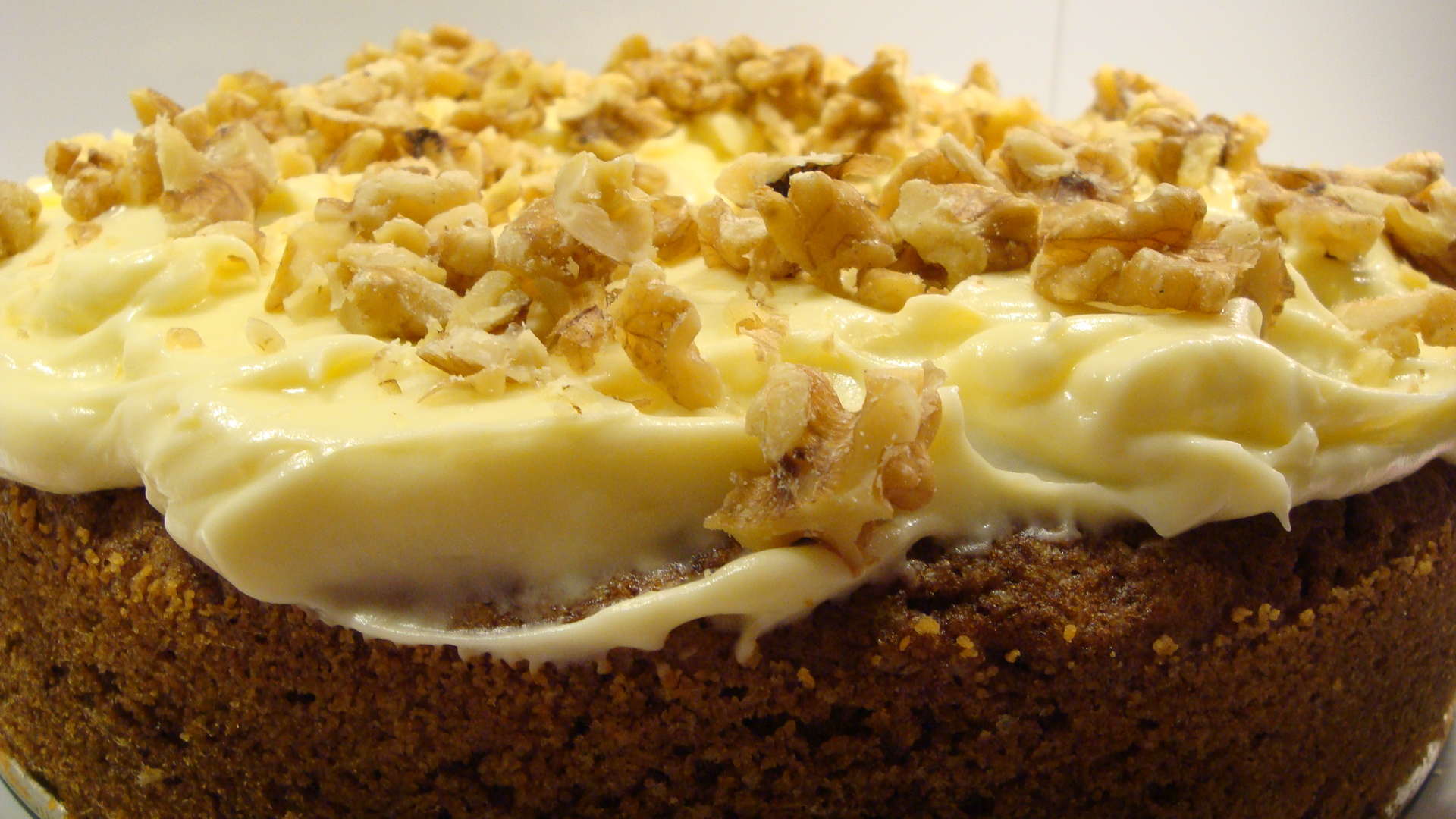 Vispa ihop florsocker, smält smör och Philadelphiaost till en kräm. Tillsätt vaniljsocker. Smaka av med citronskal och citronsaf. Vispa noga. Bred ut krämen över kakan och dekorera med mycket valnötter. Förvar gärna i kylskåp så den hinner ”sätta sig” innan servering.