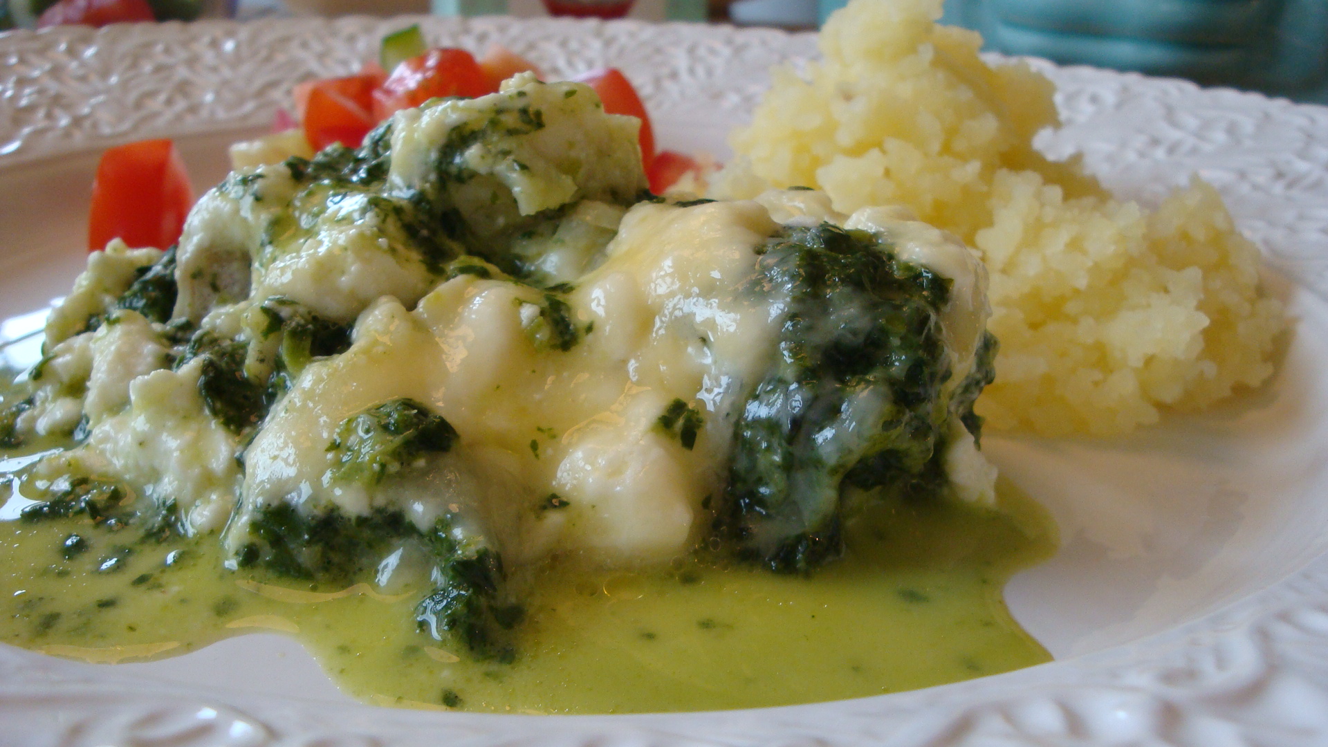 Skala och finhacka vitlöken. Bryn i olivolja tillsammans med den frysta spenaten. Tillsätt matlagningsgrädden och låt koka cirka 5 minuter. Smaka av med salt och vitpeppar.