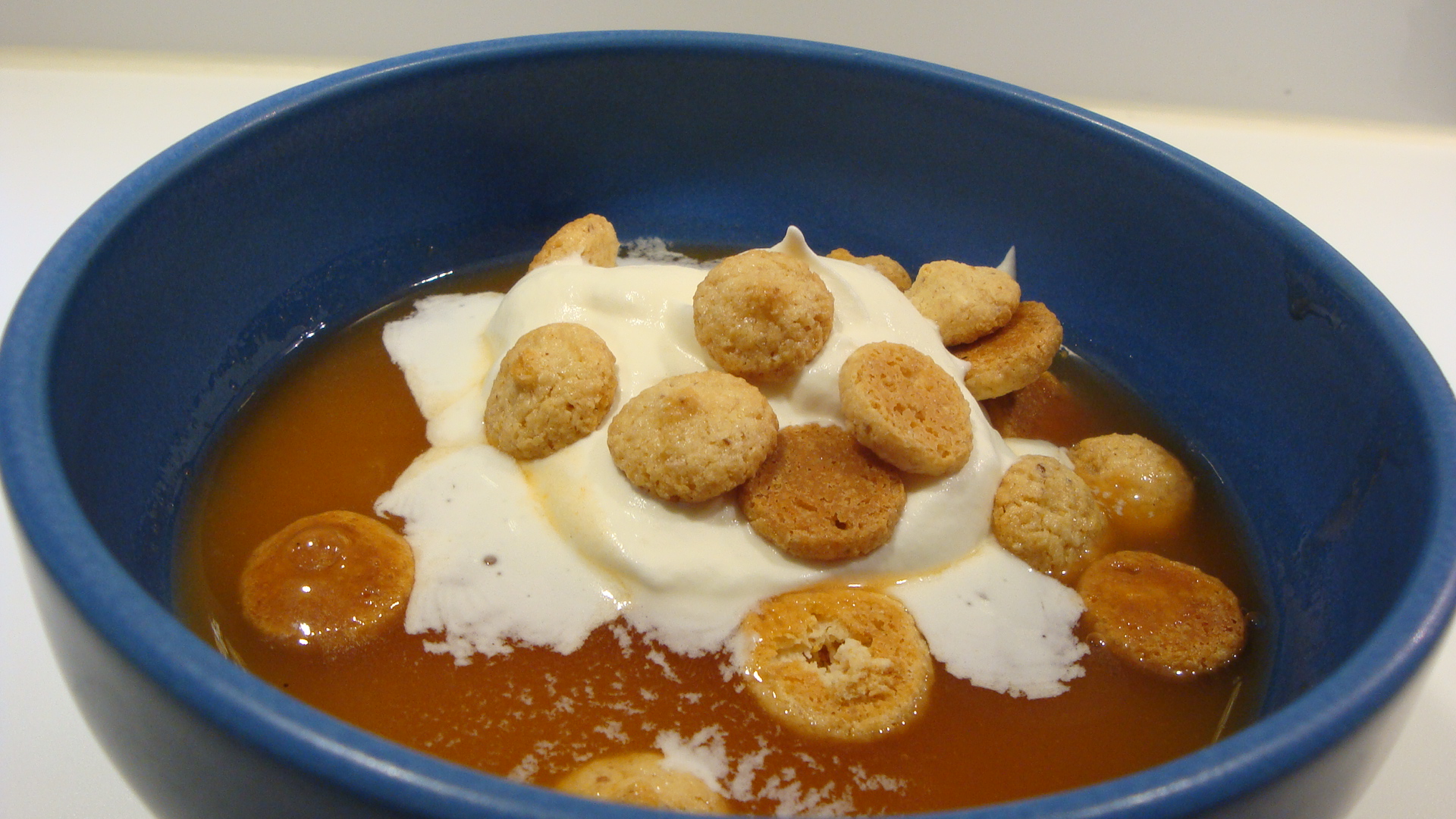 Servera den färdiga soppan med vaniljgrädde och mandelbiskvier.