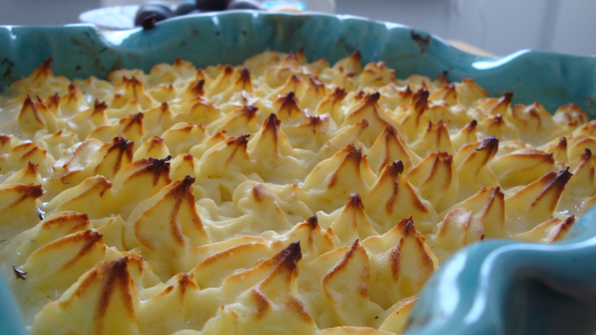 Koka potatisen och häll av vattnet. Tillsätt 25 gram smör, 1 dl grädde och ägget. Vispa/mosa tills du tycker det är lagom koncistens. Salta och peppra. Spritsa eller klicka sedan ut potatismoset övers i formen och gratinera i cirka 20 minuter, 220 grader.